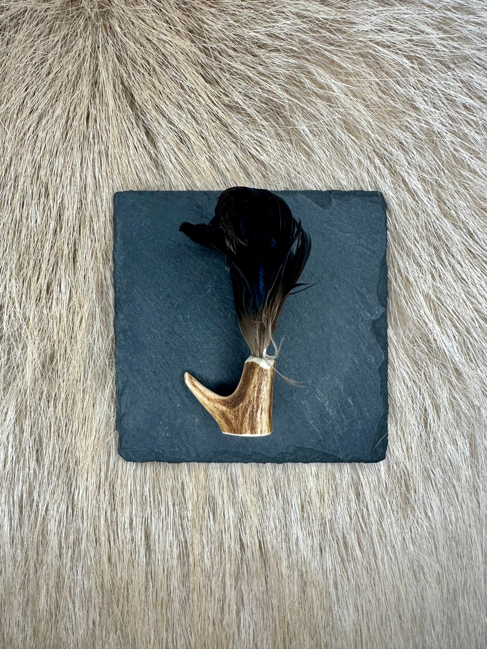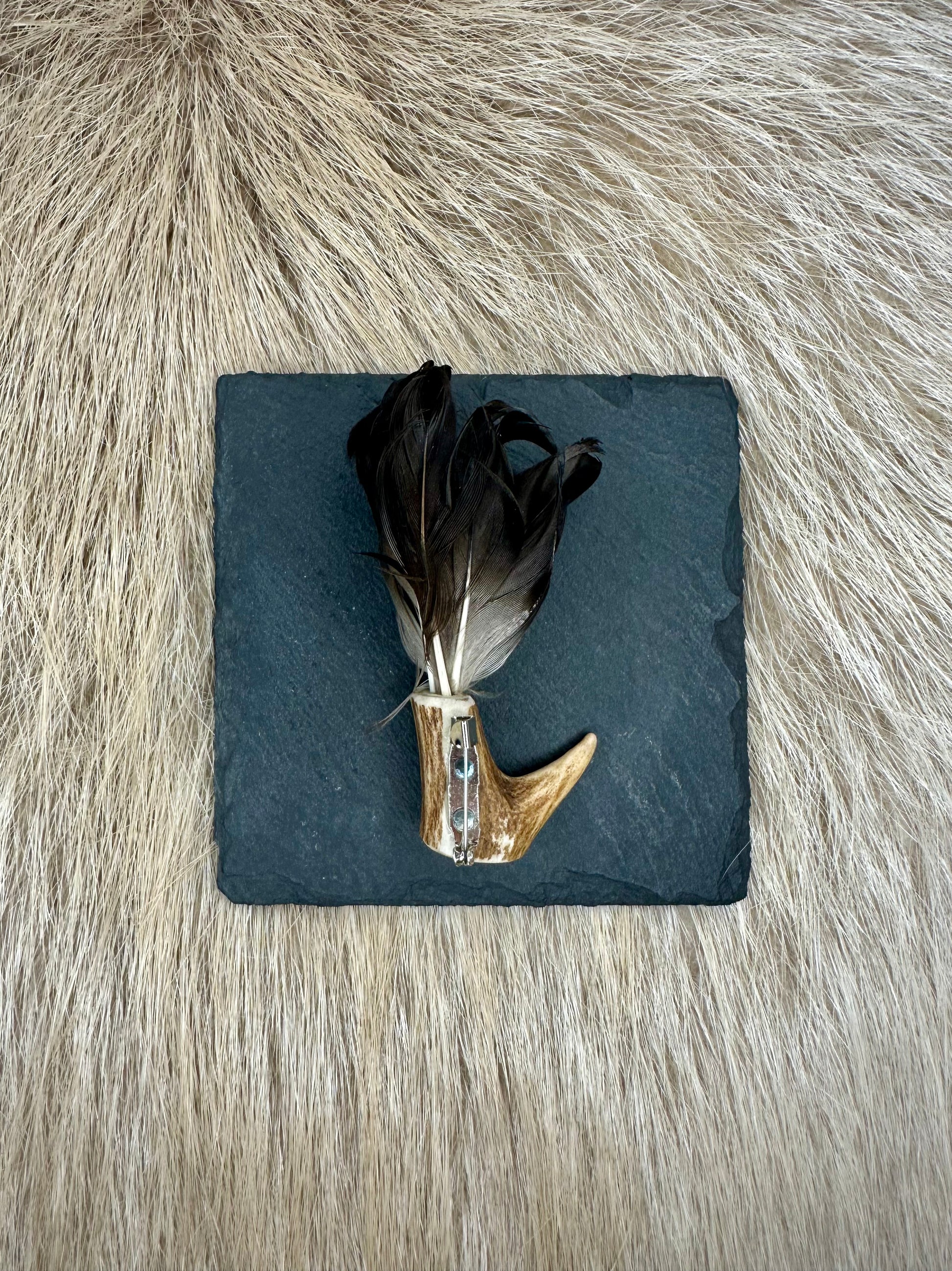 - Material: Rehgeweih mit Entendraller, Metallnadel